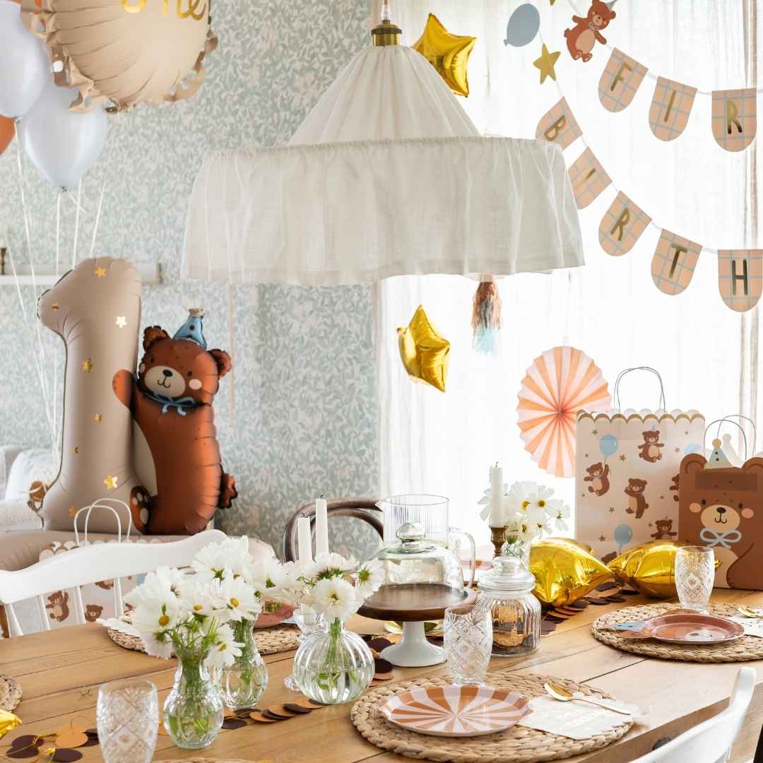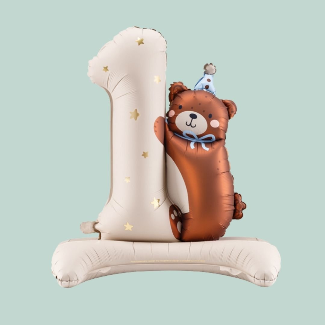 The adorable number "1" foil ball with a teddy bear is the perfect decoration for your little hero's first birthday party. Soft shades and a cute bear make it an adorable eye-catcher at the party.