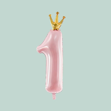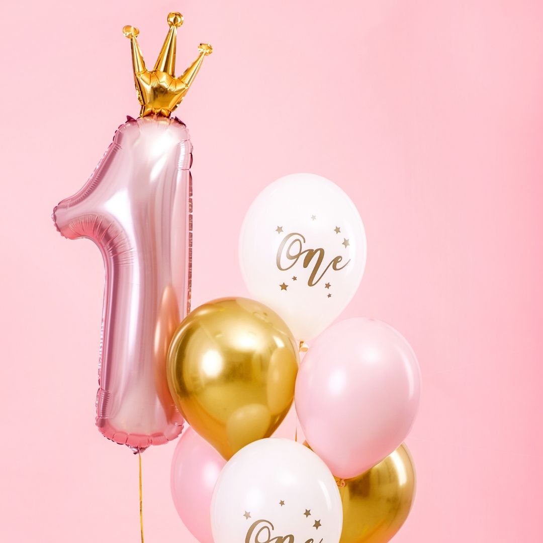 Cute pink number ball for a small child's 1 year birthday. The ball is crowned with a golden crown.