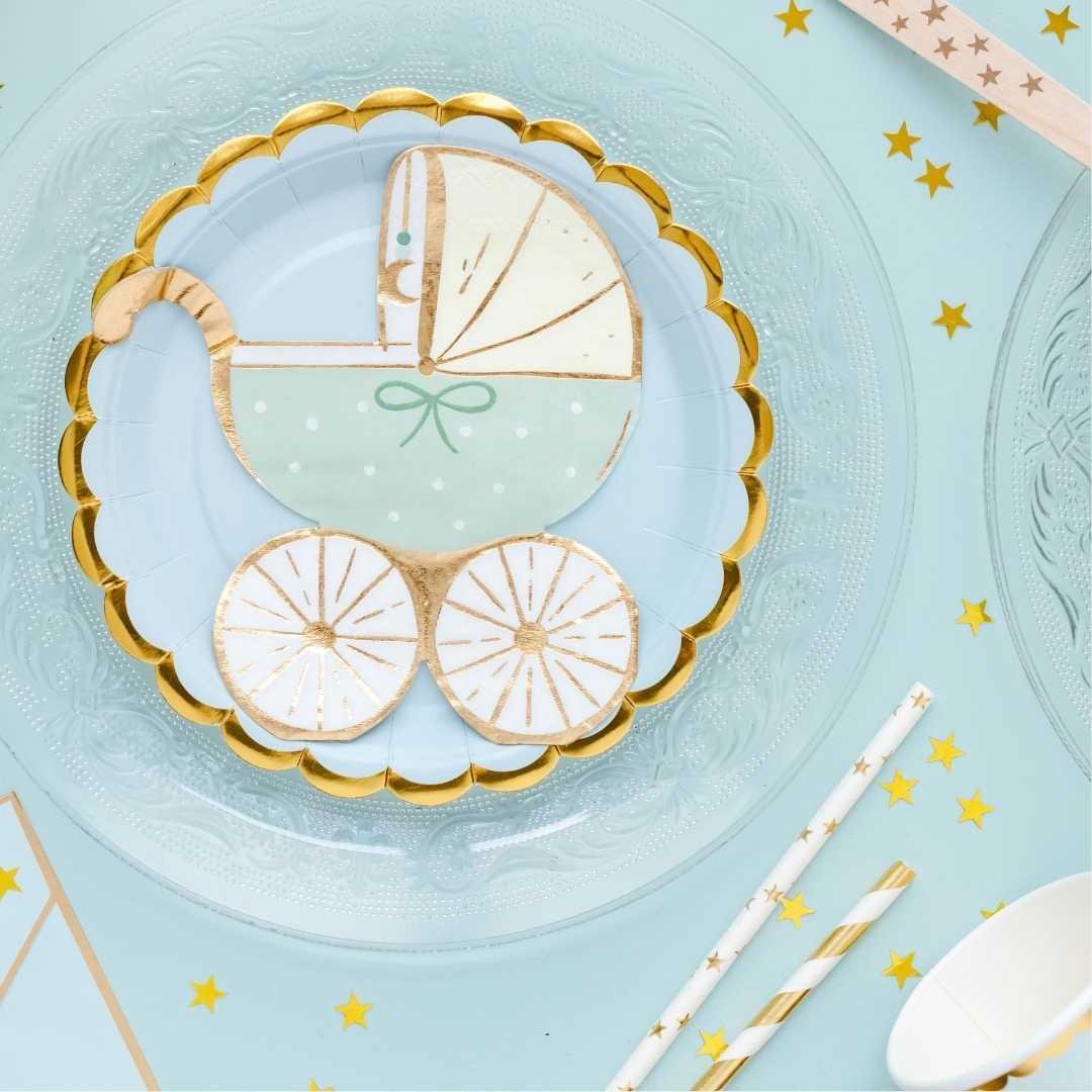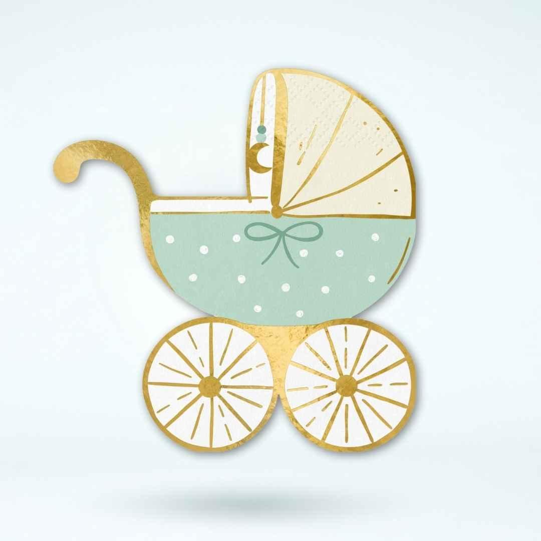 These incredibly beautiful and cute pram-shaped paper napkins in a light green shade add a soft and refined touch to your table setting. The subtle gold print adds a touch of festivity to the napkins without being overly ostentatious. These are particularly well suited for all parties for babies and children, baby showers, gender reveal parties, and first birthday parties.