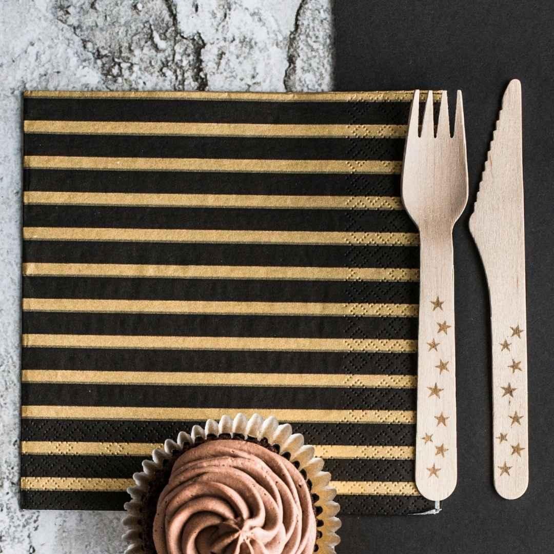 Stylish black paper napkins with gold stripes add a modern and festive touch to your table setting. The contrasting black and gold combination is timeless and easy to combine with many different themes and color schemes.