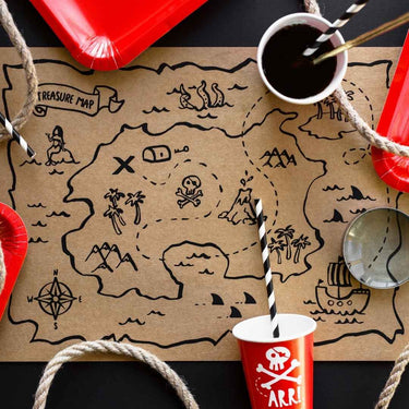 plates, mugs, napkins, straws, cutlery, pirate map table tray