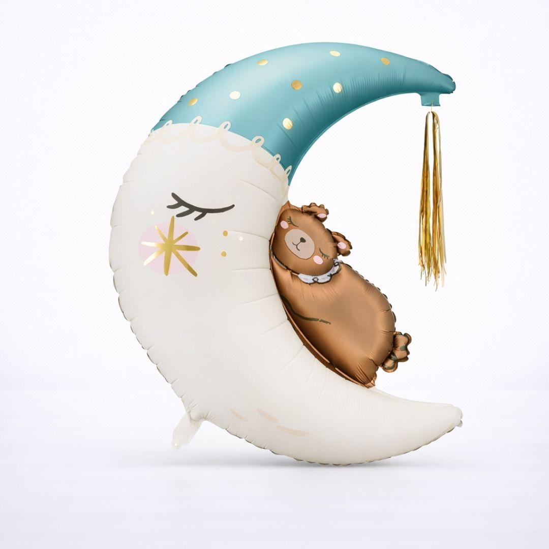 A lovely foil ball with a teddy bear sleeping on the moon. The ball has a light blue detail and a gold tassel, which add a touch of colour to the decoration. Perfect for baby showers, christenings and children's parties.