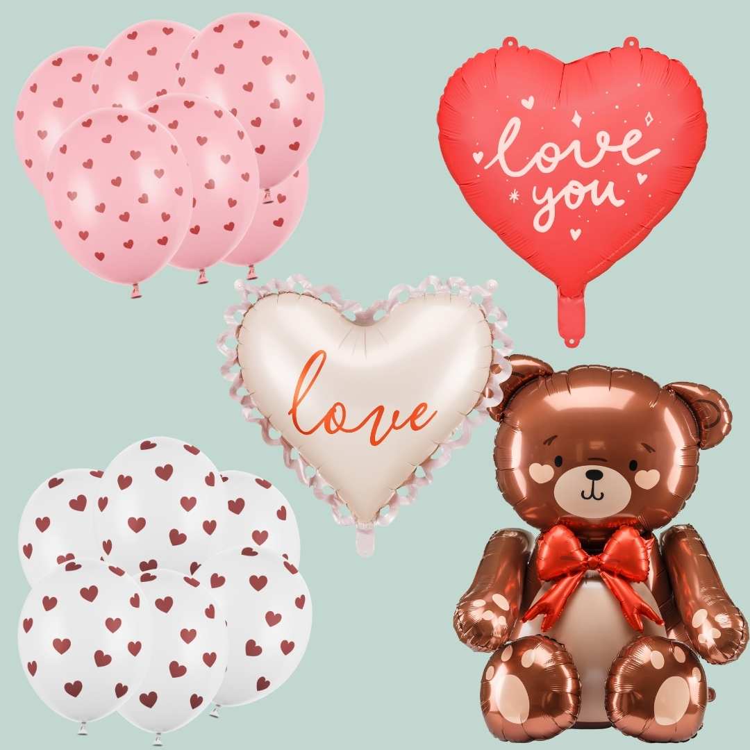 That's all you need! The Valentine's Day balloon set combines hearts, soft colors, and a cute teddy bear.