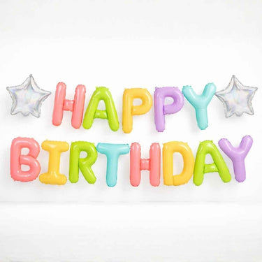 The long and impressive Happy Birthday foil balloon is an eye-catching addition to any party venue. The soft pastel color scheme (yellow, pink, light green, mint, and lilac) creates a light and cheerful look, and the two iridescent stars that come with it add a subtle sparkle to the whole.