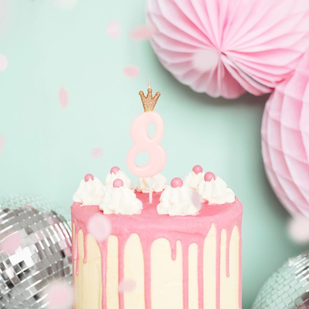 A beautiful birthday candle with a golden crown in a light pink shade crowns the cake on the birthday of the little birthday boy or girl.
