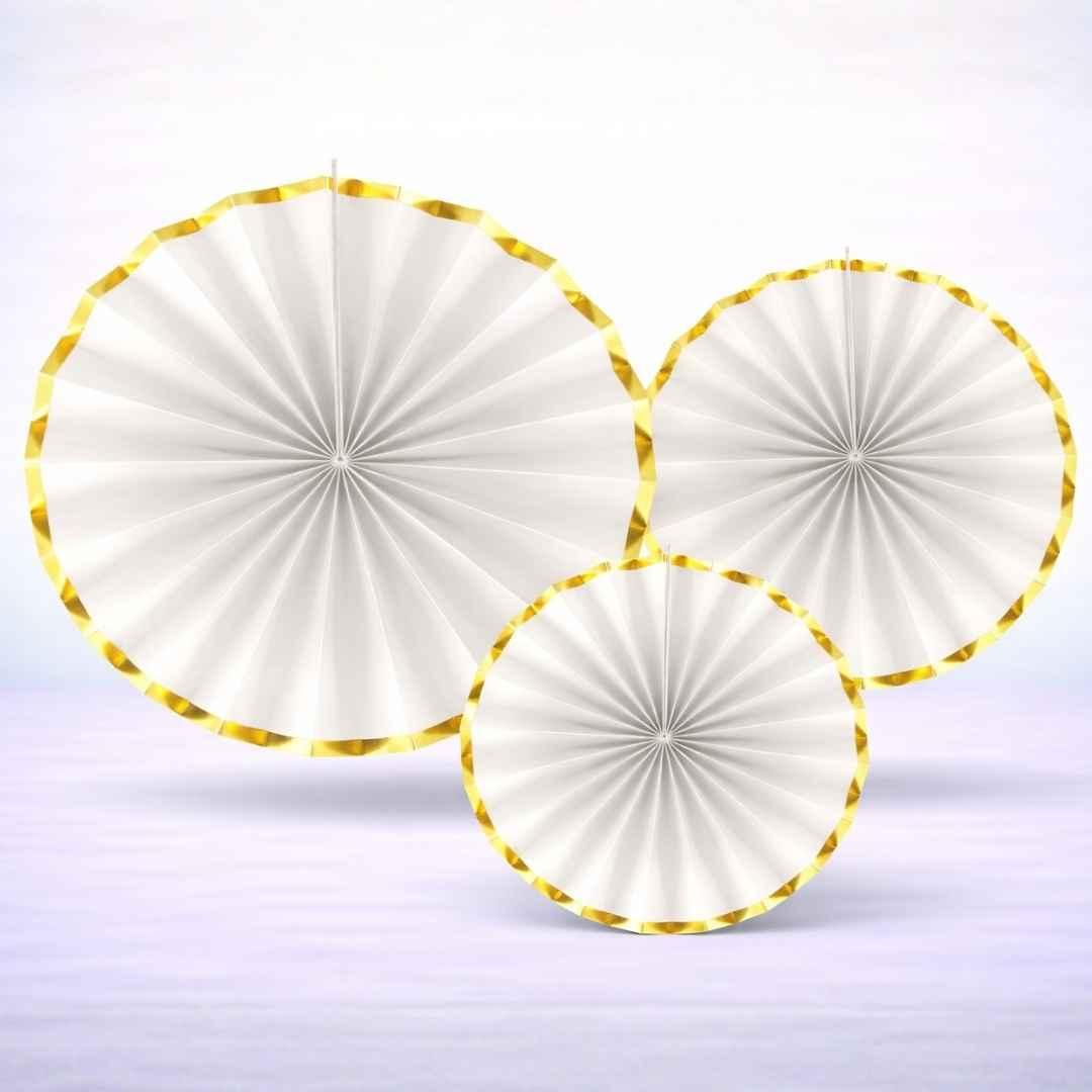 Set of three white decorative rosettes with gold edges.