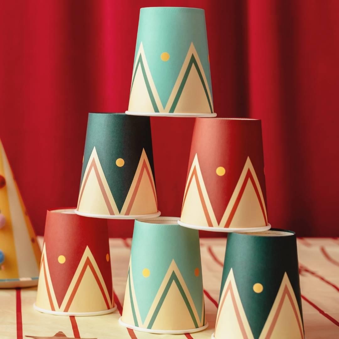 Colorful circusthemed paper cups for circus-themed and carnival-themed birthday parties and children's celebrations. Cheerful color scheme and playful circus theme make the table setting fun and easy theme .