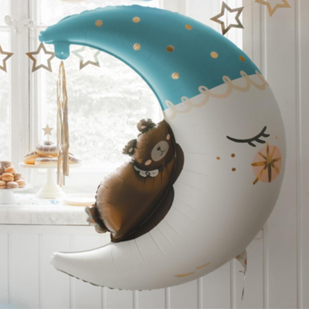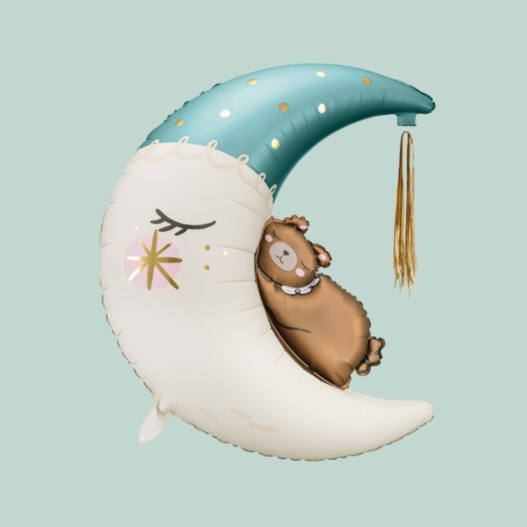A lovely foil ball with a teddy bear sleeping on the moon. The ball has a light blue detail and a gold tassel, which add a touch of colour to the decoration. Perfect for baby showers, christenings and children's parties.