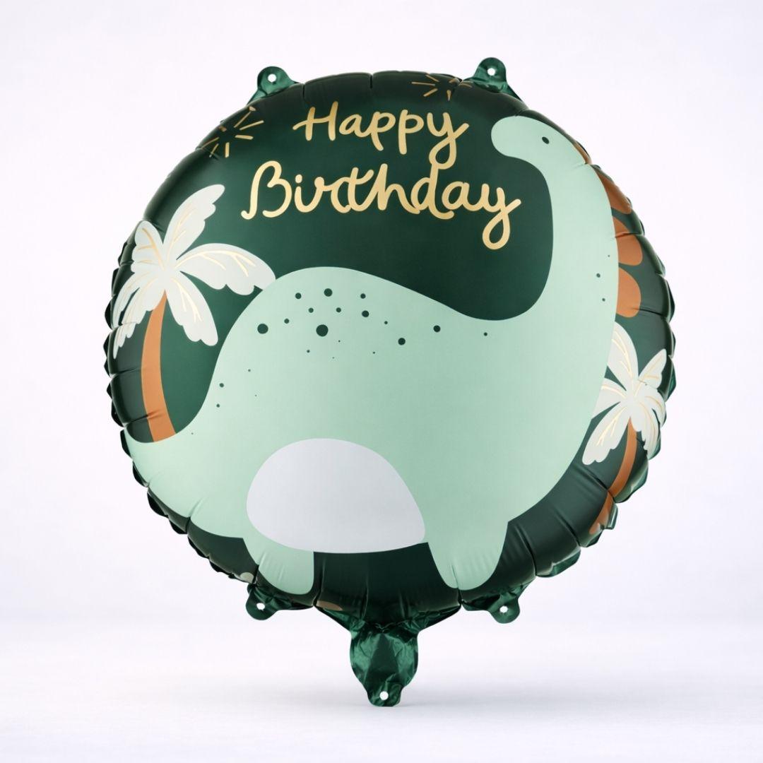 A cute and beautiful round Happy Birthday foil balloon with a green background, dinosaur illustration, and gold Happy Birthday text.