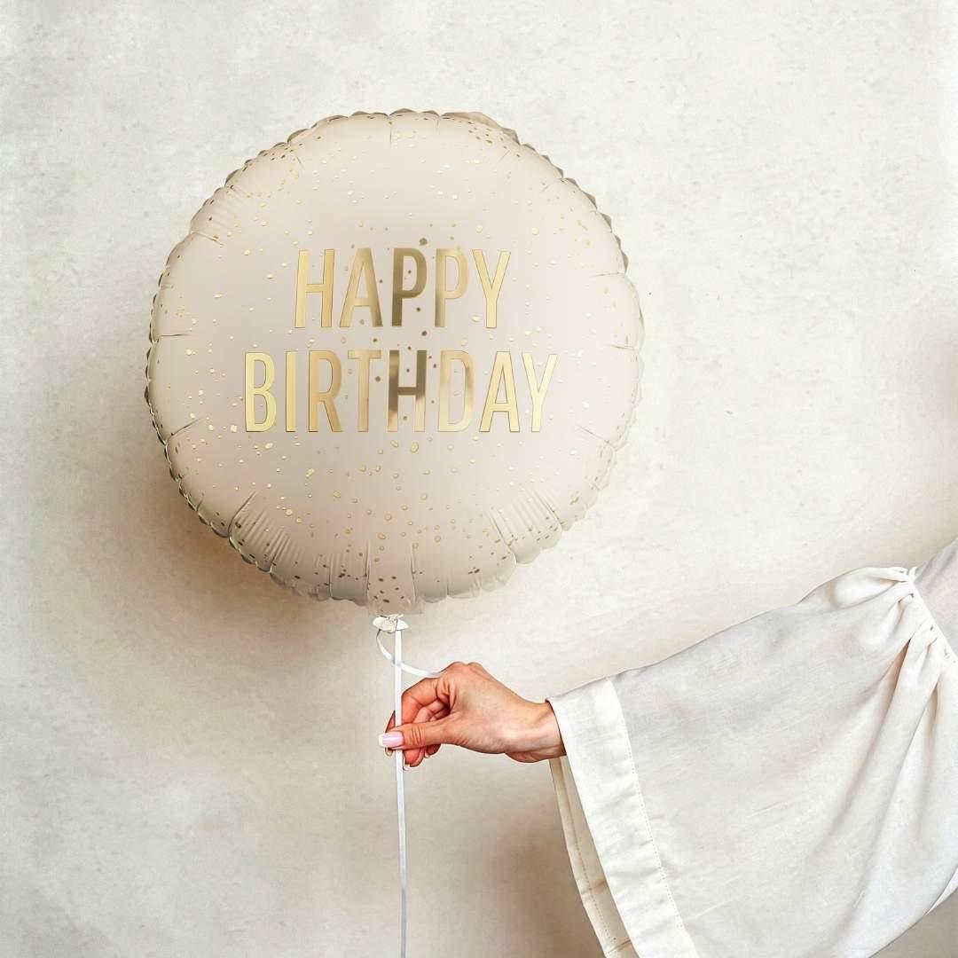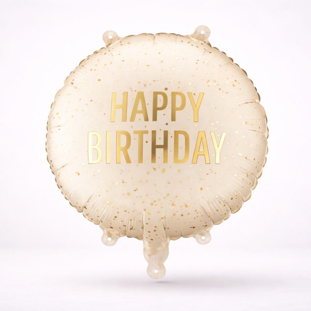 A cute and beautiful round Happy Birthday foil balloon in cream color with gold details.