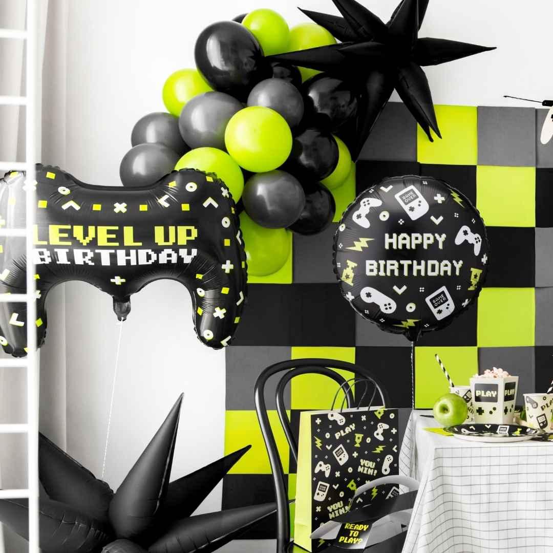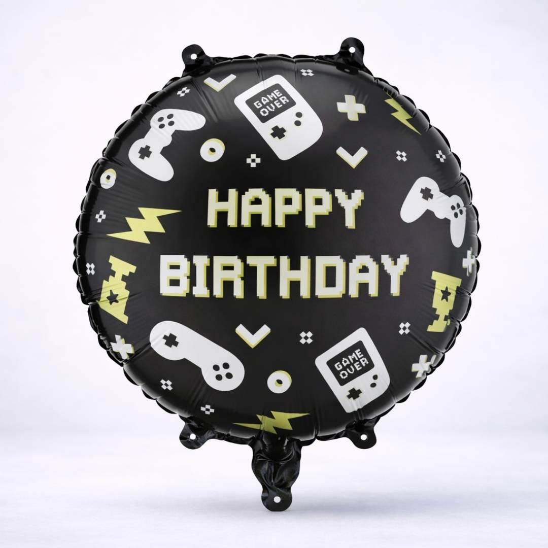 An eye-catching round Happy Birthday foil balloon with a print that matches the game theme. Black balloon with yellow Happy Birthday text and fun game-themed patterns.
