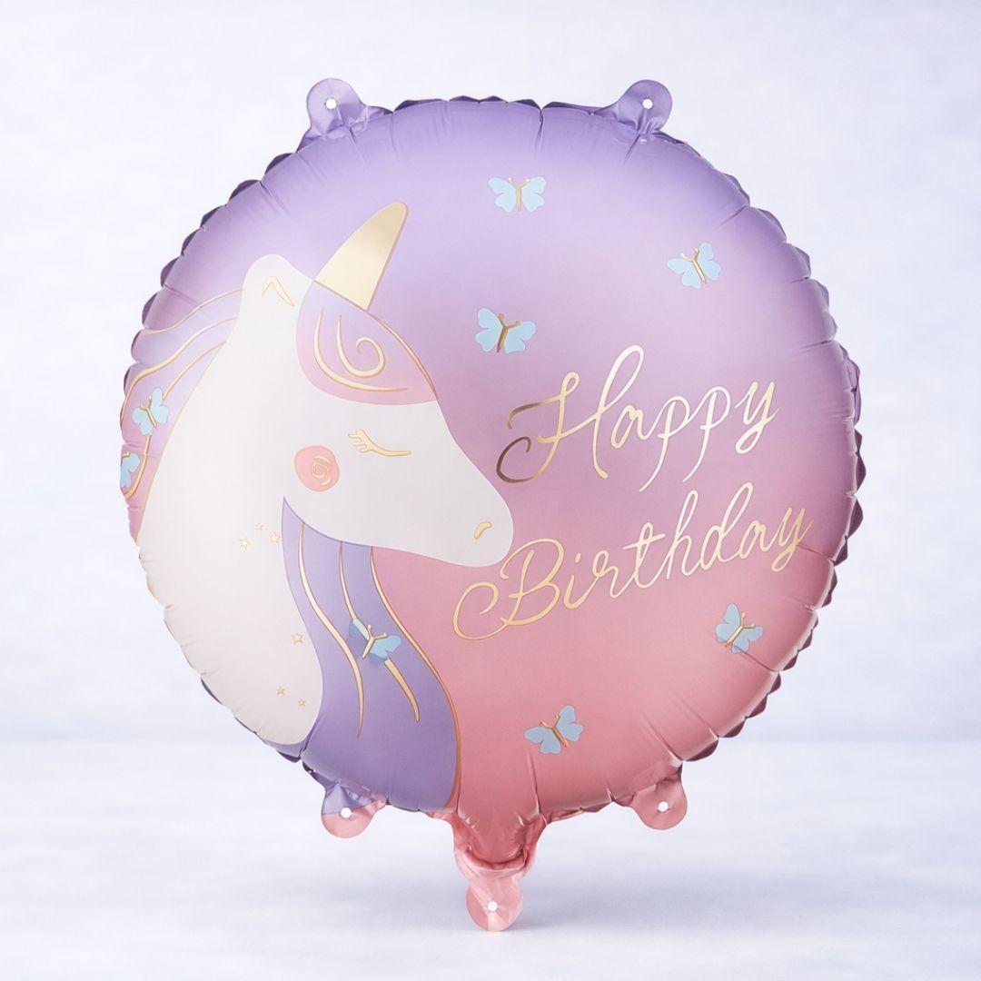 This cute round Happy Birthday foil balloon with a unicorn illustration adds a light and magical touch to your party decorations. The lavender and pink tones combined with gold lettering create a harmonious and polished look.