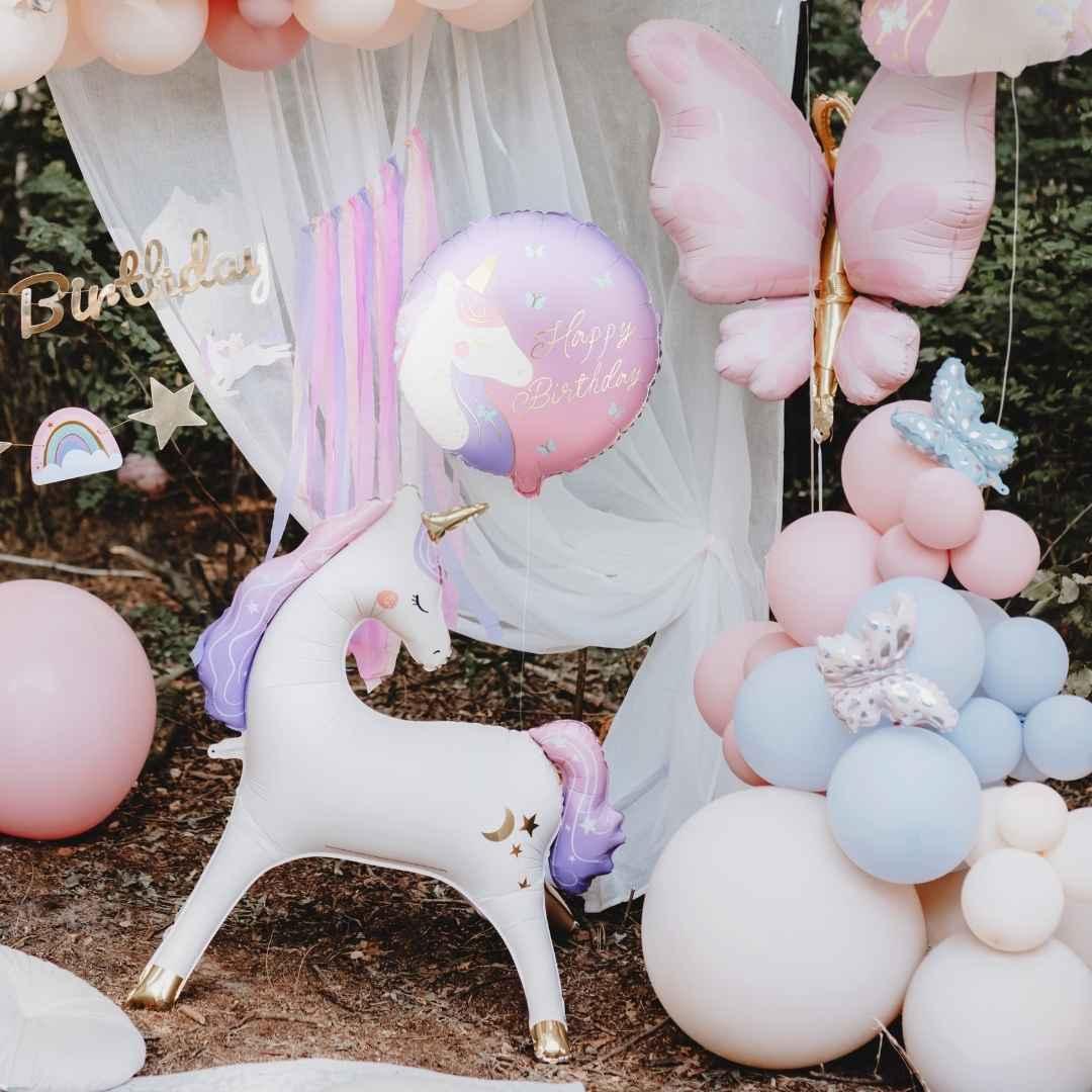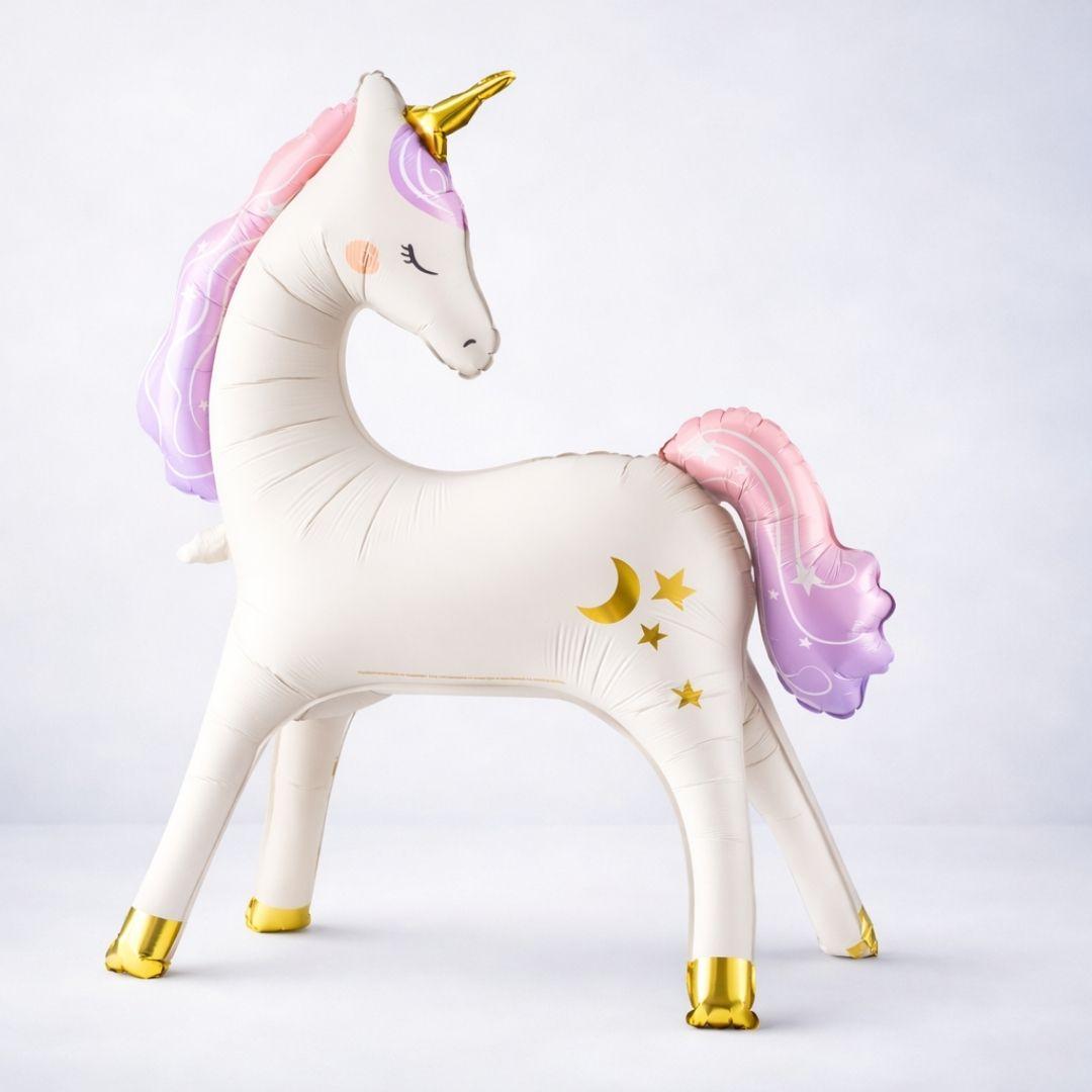 The adorable , a standing unicorn-shaped foil balloon in beige, adds a soft and magical touch to your party decorations. The matte finish and gold and rainbow-colored details make the balloon a striking yet understated piece that stands upright on its own.