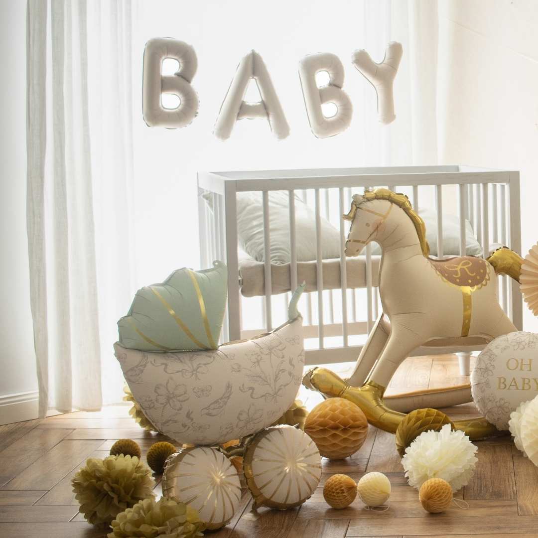 The subtle, beautiful beige-toned "Baby" foil balloon is perfect for baby showers, gender reveal parties, christenings, naming ceremonies, and first birthday parties. The matte beige tone creates a calm and timeless look that is easy to combine with different color schemes and decorations.