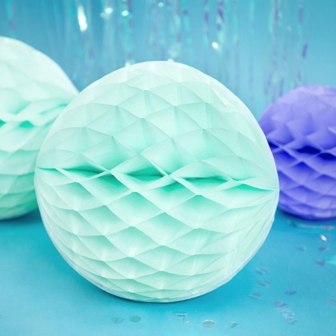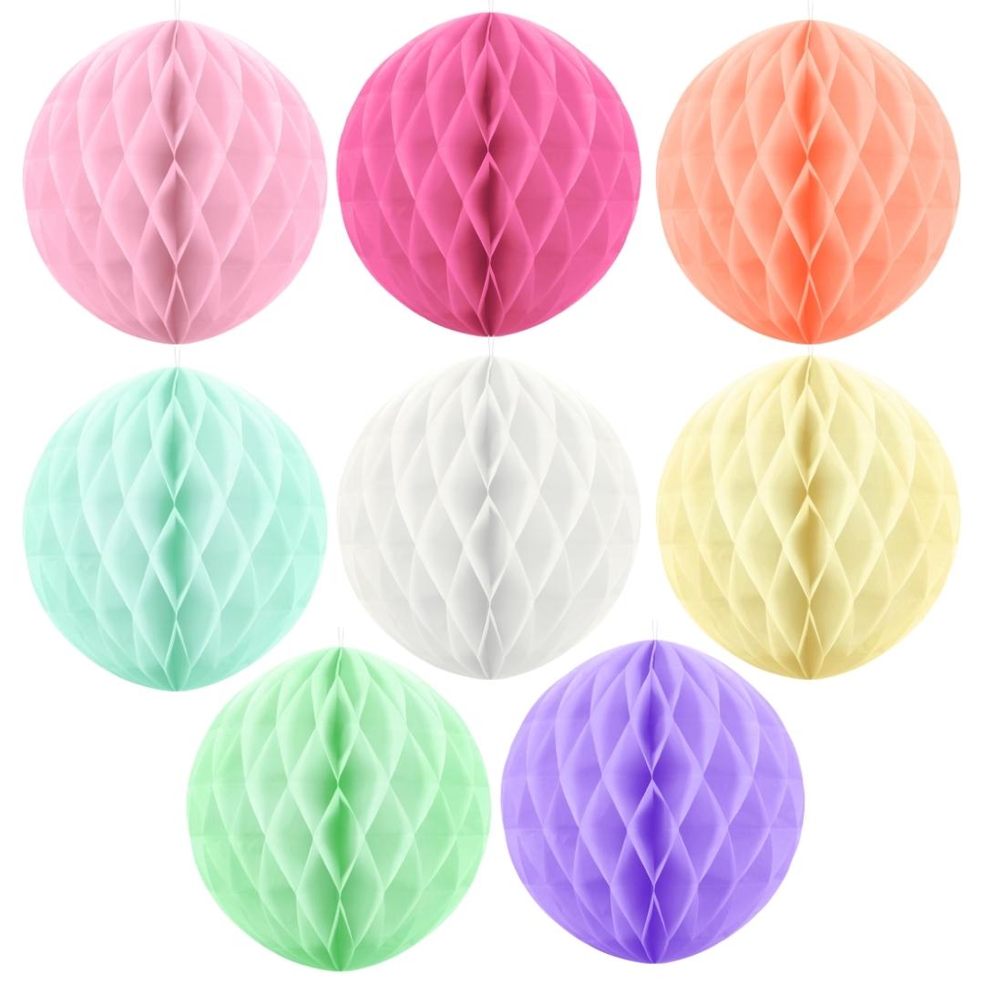 The honeycomb ball is a light and eye-catching paper decoration that adds three-dimensionality and a soft look to any space. The decoration is easy to open and close with a clip, and can be reused for many different occasions.