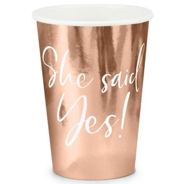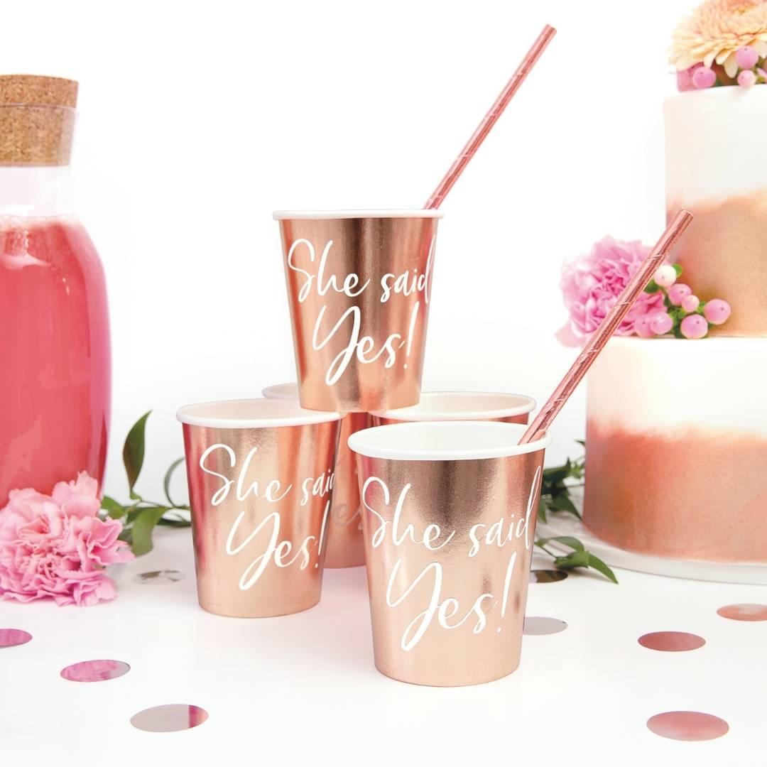 Beautiful She Said Yes! -paper cups rose gold shade to a festive touch a spectacular and festive and appearance. The cups white "She said yes!"text makes them the choice for bachelor parties, engagement parties or other for the bride . .